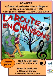 Une communication de notre collègue Nicolas Michel du collège des Thermes à Luxeuil- les-Bains: Le chœur et l’orchestre du collège Jules Jeanneney de Rioz et du collège des Thermes de Luxeuil-les-Bains sont heureux de vous convier à leur concert de fin d’année « La route en chansons ». La chorale …