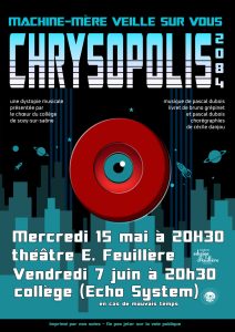 Une communication de notre collègue Pascal Dubois, compositeur et chef de chœur. Les 100 choristes du collège de Scey-sur-Saône présentent leur nouvelle comédie musicale : CHRYSOPOLIS 2084 Au théâtre Théâtre Edwige Feuillère de Vesoul le 15 mai à 20h30 (7€) : https://billetterie.theatre-edwige-feuillere.fr/spectacle… Et au collège avec l’aide technique …