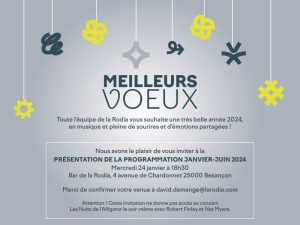 J’ai le plaisir de vous adresser ci-dessous les vœux de la Rodia et une invitation pour notre présentation de programmation qui se déroulera le 24 janvier prochain à la Rodia. Au plaisir de vous croiser à cette occasion ou très prochainement David DEMANGE Directeur de la Rodia et du festival Détonation www.larodia.com / detonation-festival.com …