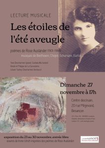 Introduction à la lecture Rose Ausländer L’association franco-allemande Consonances présente la poétesse Rose Ausländer (1901-1988) lors d’une lecture musicale bilingue le 27 novembre à 17h au Centre Diocésain ainsi que l’artiste peintre de Freiburg Irene Ulrich, inspirée par les poèmes de l’écrivaine. Née en Bucovine, région aujourd’hui partagée entre la Roumanie et l’Ukraine, philosophe …