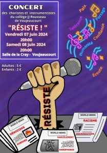 Une communication de nos collègues Maïté et Ben du collège Jean-Jacques Rousseau de Voujeaucourt: Résiste! un concert des choristes et instrumentistes du collège Jean Jacques Rousseau de VOUJEAUCOURT qui vont interpréter des chansons en lien avec plusieurs formes de discriminations, racisme, génocides, harcèlement scolaire et discriminations de genre, afin de les dénoncer et d’y …
