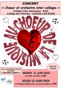 Une communication de notre collègue Nicolas Michel du collège de Luxeuil-les-Bains: Le chœur et l’orchestre inter-collèges du collège Jules Jeanneney de Rioz et du collège des Thermes de Luxeuil-les-Bains vous présentent leurs concerts de fin d’année » Au chœur de la musique » qui auront lieu le mardi 11 juin 2024 au CCSL de Rioz à 20h et le jeudi …