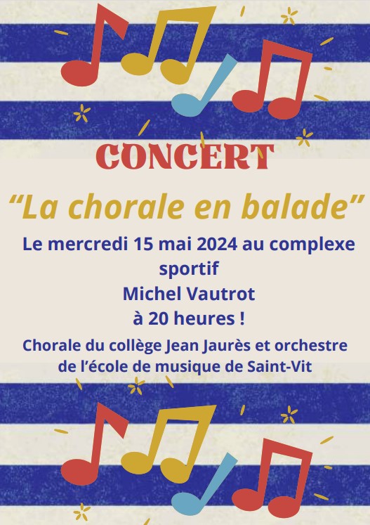 Un communication de notre collègue Émilie Verzelloni du collège Jean Jaurès de Saint-Vit, la chorale du collège se produira en concert accompagnée par l’orchestre de l’école de musique le mercredi 15 mai à 20h: