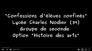 Comment vivez-vous le confinement général ? Est-ce facile de suivre les cours à distance ? Suivez-vous l’actualité en continu ? Avez-vous peur ? Souffrez-vous ne pas pouvoir sortir librement ? Les élèves de seconde « histoire des arts » se confient… Enregistrements effectués pendant la période de confinement général. Extraits musicaux : Anouar Brahem, Daniel Goyone, The Pink Floyd, Jaco Pastorius.