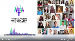 Toutes les Machines ont un Cœur – Zazie & Calogero Plus que jamais les machines ont un coeur! Mais c’est bien celui des élèves du collège Olympe de Gouges, avec leur enseignante, qui se trouve derrière les ordinateurs, smartphones et autres machines qui ont permis cette interprétation virtuelle – mais bien réelle… – magnifiquement réalisée en période de confinement.  Bravo! Direction musicale: Aurélie Geffroy