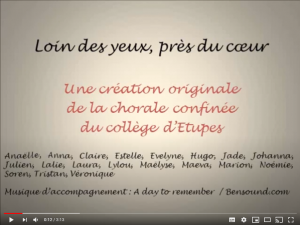 …Pour garder un contact « vocal » avec les choristes (élèves et professeurs), pour partager ces moments musicaux avec les parents et l’ensemble de la communauté éducative du collège, via la mise en ligne sur le site Facebook du collège, et sur une chaine privée Youtube. Direction musicale : Evelyne Bertoni. Loin des yeux près du coeur Une création « slam », avec des textes d’élèves déclamés en lien avec la situation de confinement (adressés à un ami, membre de la famille, hommages aux victimes, soignants…). Carmen – Stromae Les choristes ont enregistré un couplet chacun et le refrain. Ils ont été peu nombreux, par rapport à l’effectif choral du collège, mais ils ont été rejoints par une bande de professeurs très motivés !