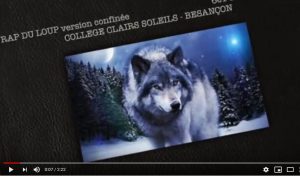 Rap du loup Dans le cadre de la séquence « Portraits d’animaux », pour son projet musical la classe de 6e Sarah Vaughan du collège Clairs Soleils a travaillé le « Rap du Loup ». Chaque élève a préparé puis enregistré depuis chez lui (avec l’aide du site vocaroo.com) deux phrases qui lui avaient été attribuées par le professeur (parlé, chanté ou parlé / chanté au choix). Il avait pour ressource de travail la version originale du chant https://www.youtube.com/watch?v=KOk1G7Gp99A et la version instrumentale https://www.youtube.com/watch?v=jQmw0TuwK-c Lorsqu’un petit groupe d’élèves s’est retrouvé en classe après le confinement une très courte partie chantée à plusieurs a pu être enregistrée. L’ensemble a été mixé sur des extraits de l’accompagnement instrumental du chant. Direction musicale : Hélène Thiébaux